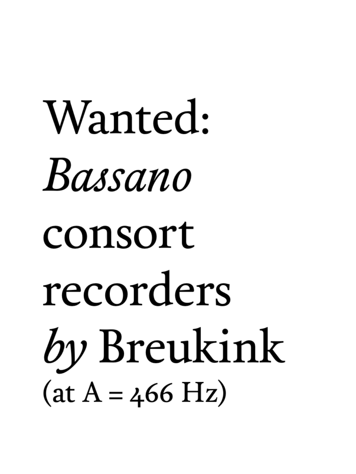Wanted — Bassano consort recorders by Adriana Breukink A professional recorder player is looking for Bassano consort recorders by Adriana Breukink at A = 466 Hz (any sizes). Please contact them via the form below if you happen to have one for sale. Thanks! Contact […]