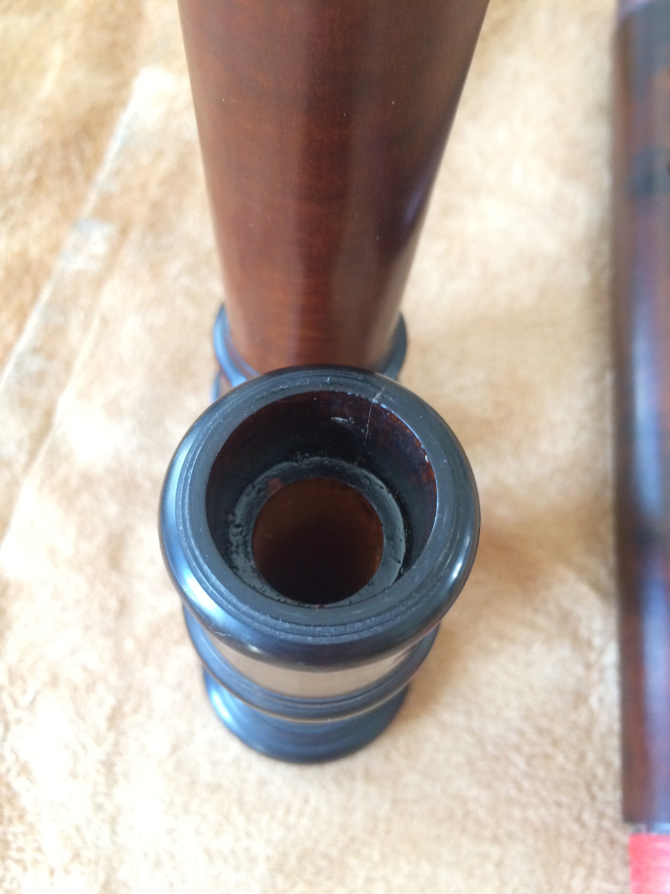 - Current state: The instrument is well maintained and has hardly been used. It has recently been revoiced, the sound is now warm (to the dirty side) and flexible in all registers. High notes speak well, the instrument has single holes and is tuned in equal temperament. It plays with Hotteterre fingering (i.e. Bb’ 012346, Bb’’ Ø12347 or Ø12346 (half covered)). There is a now glued minor crack in the foot piece.