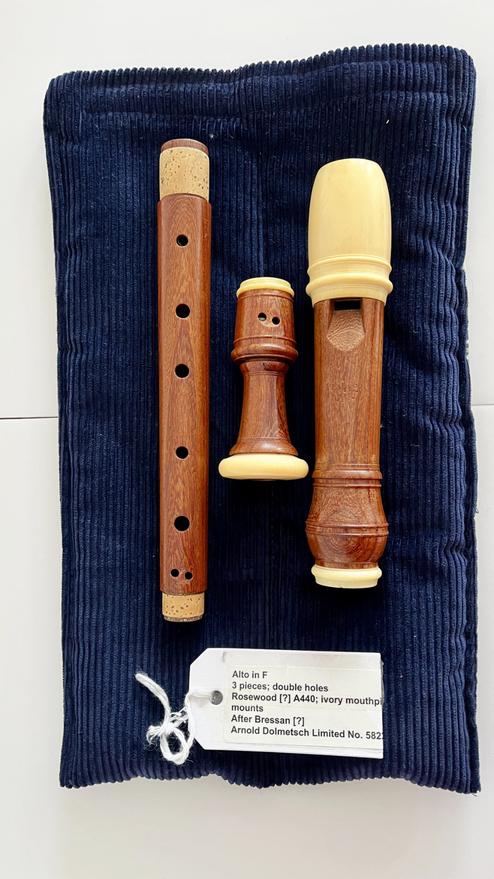 - Current state: This instrument was bought in 2015, I don’t know when it was built. It has a number 5822, which might give a clue to when it was made. It’s used, very openly voiced. The mouthpiece and rings are made of ivory (!), and it’s probably loosely based on a Bressan recorder. Cork on the joints. It comes in a soft bag.