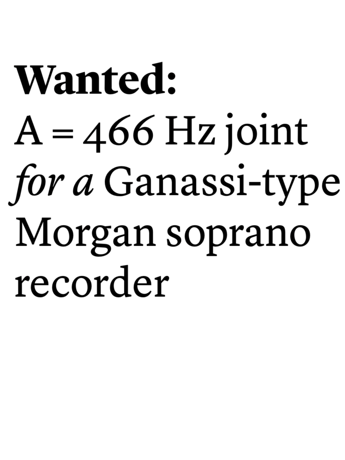 Wanted — A = 466 Hz Joint for a Ganassi-Type Morgan Soprano Recorder